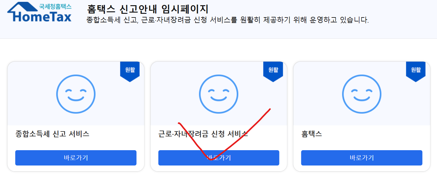 다음의 버튼을 클릭하시면 홈택스 임시 페이지로 바로 들어 가 실 수 있습니다. 확인해 보시길 바랍니다.