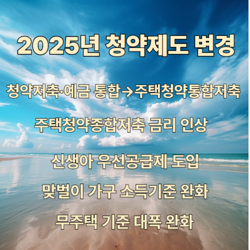 주택청약통합저축, 납입액 상향, 신생아 우선공급, 맞벌이 소득기준 완화(최대 200%), 무주택 기준 완화가 2025년 청약제도의 핵심 변화입니다.