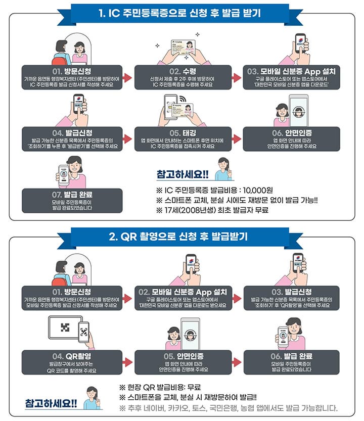 - (QR발급) 무료 / (IC주민등록증) 재발급 수수료(5,000원) + IC 비용(5,000원)